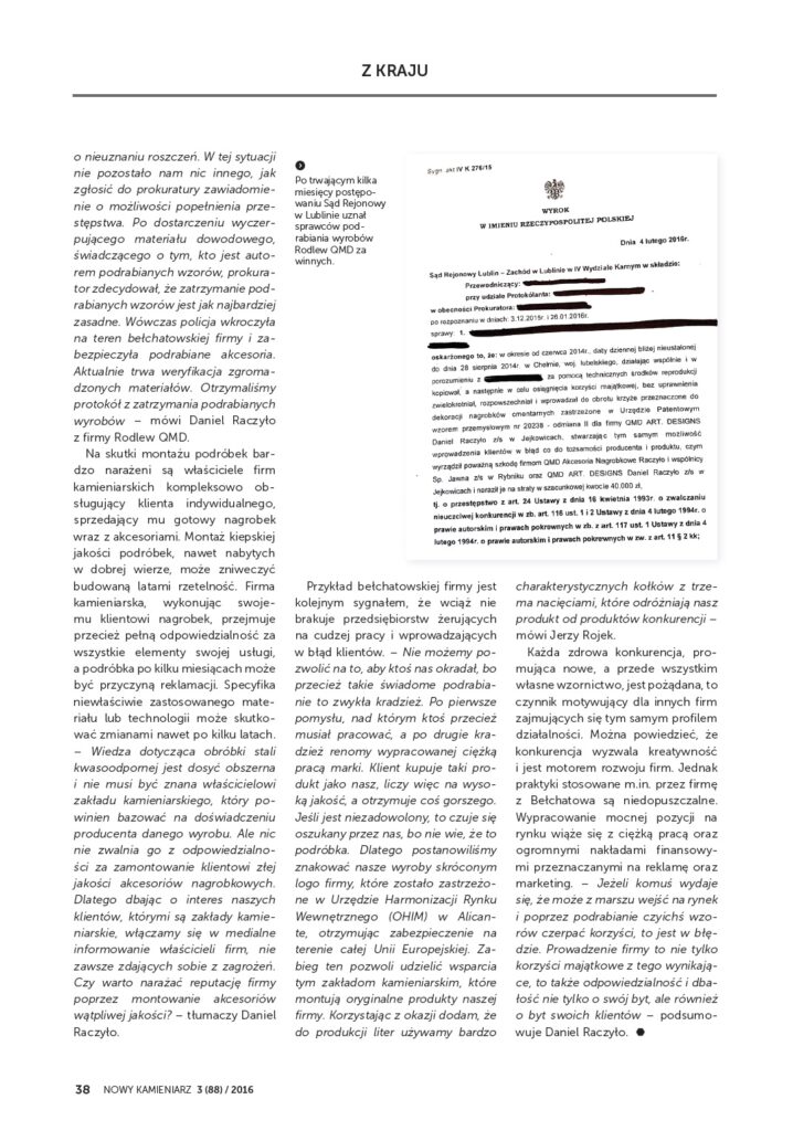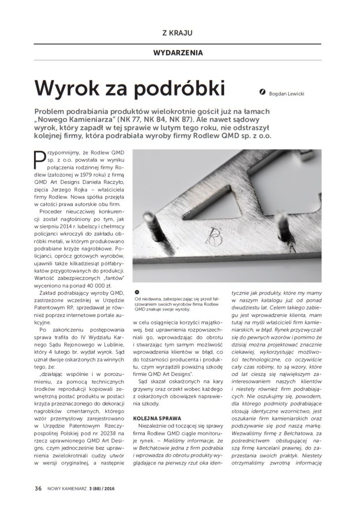Od jakiegoś czasu prezentujemy Państwu ciąg wydarzeń , który dotyczy ukracania działań nieuczciwej konkurencji. Używanie znaków towarowych oraz innych wzorów wykreowanych przez firmę Rodlew ,a później Rodlew QMD jest i będzie uważane za działanie na szkodę samej firmy, jak i firm kamieniarskich. W poniższym artykule opisujemy kolejny etap naszych stanowczych działań.
