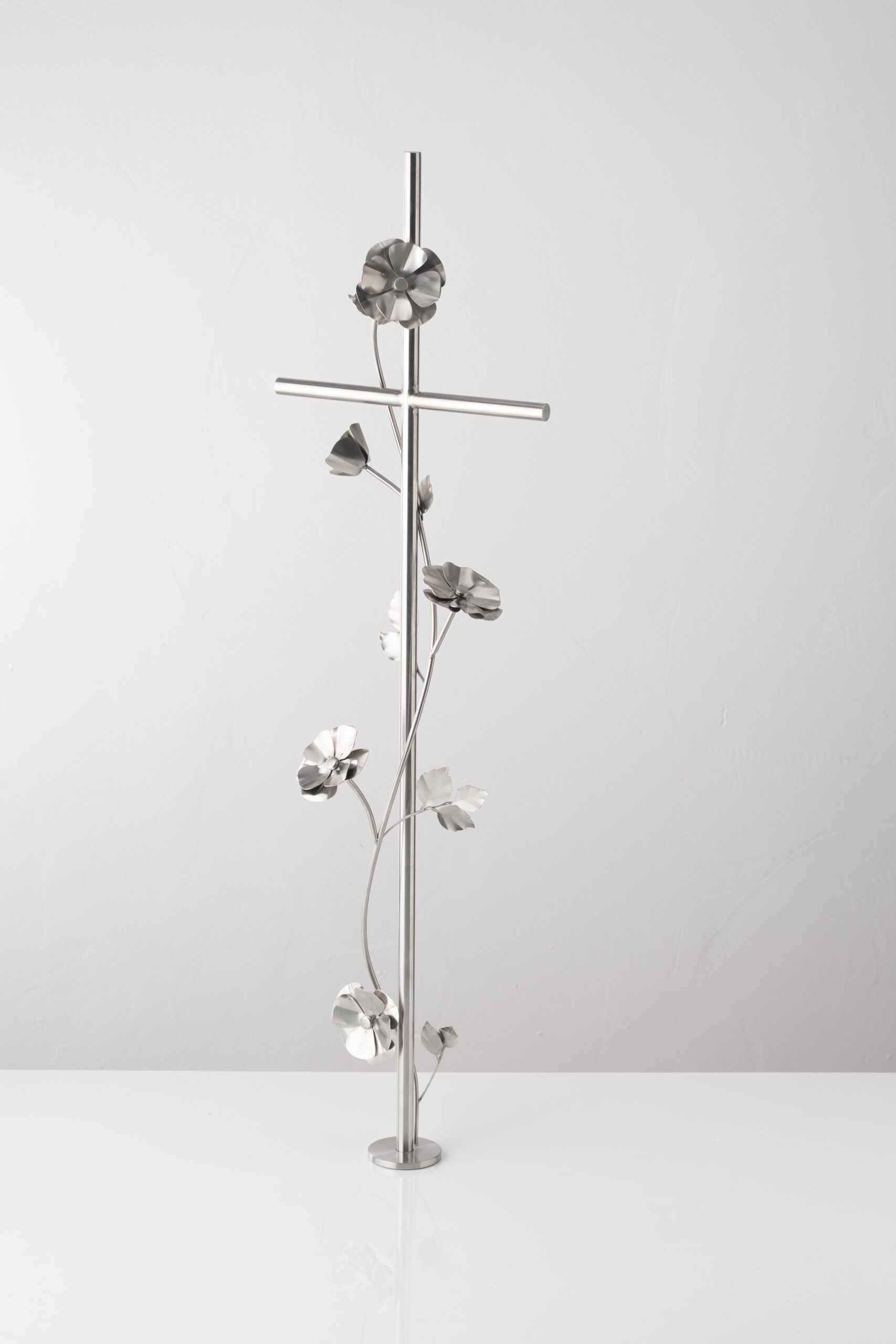 Krzyż stojący składający się z pręta fi 12 mm opleciony kwiatami na cienkiej stalowej gałązce.