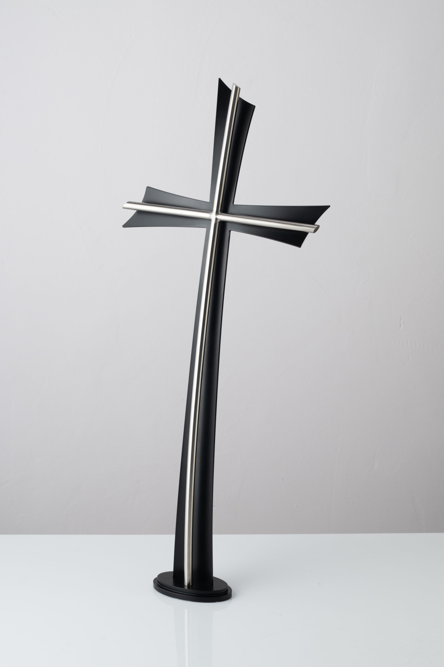 Krzyż stojący z półokrągłej łuski malowanej na czarno i okrągłego pręta srebrnego.
