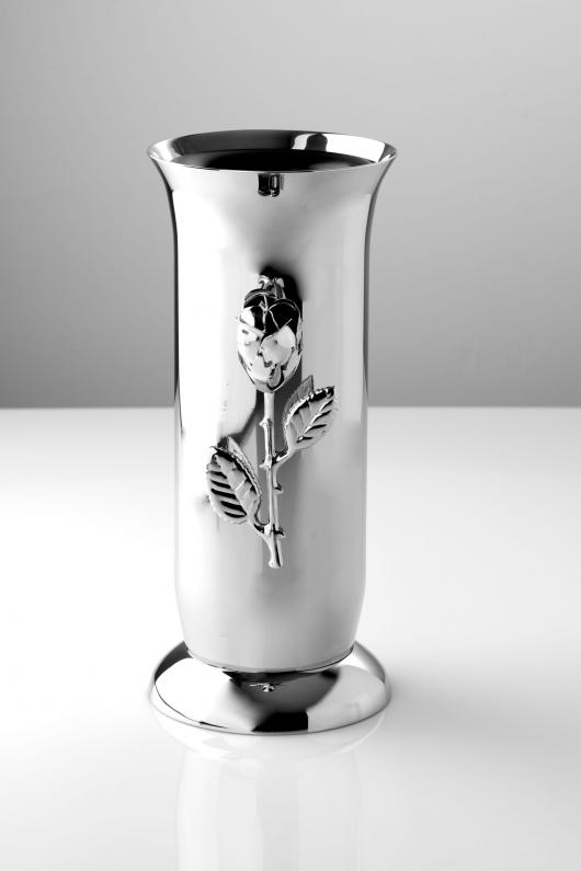 Wazon okrągły z różą jako centralny element dekoracyjny.