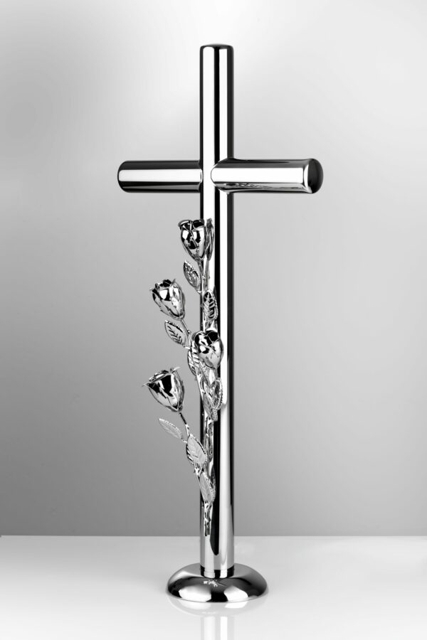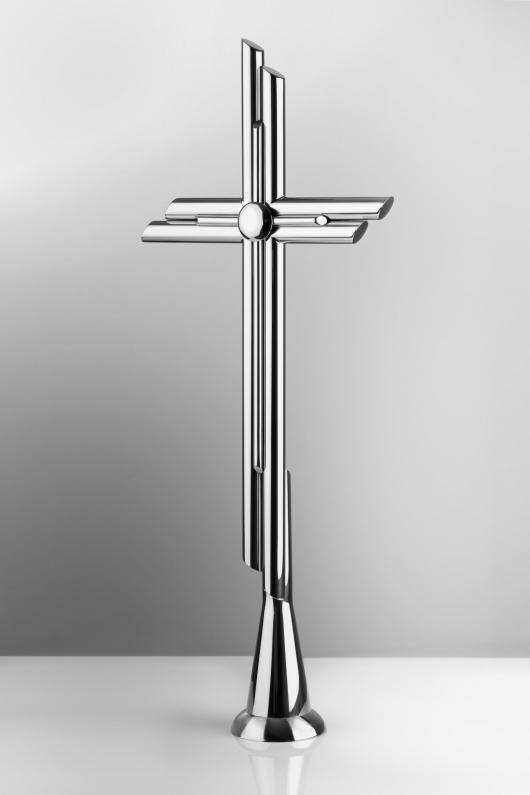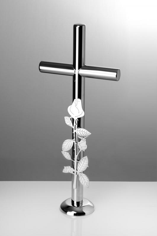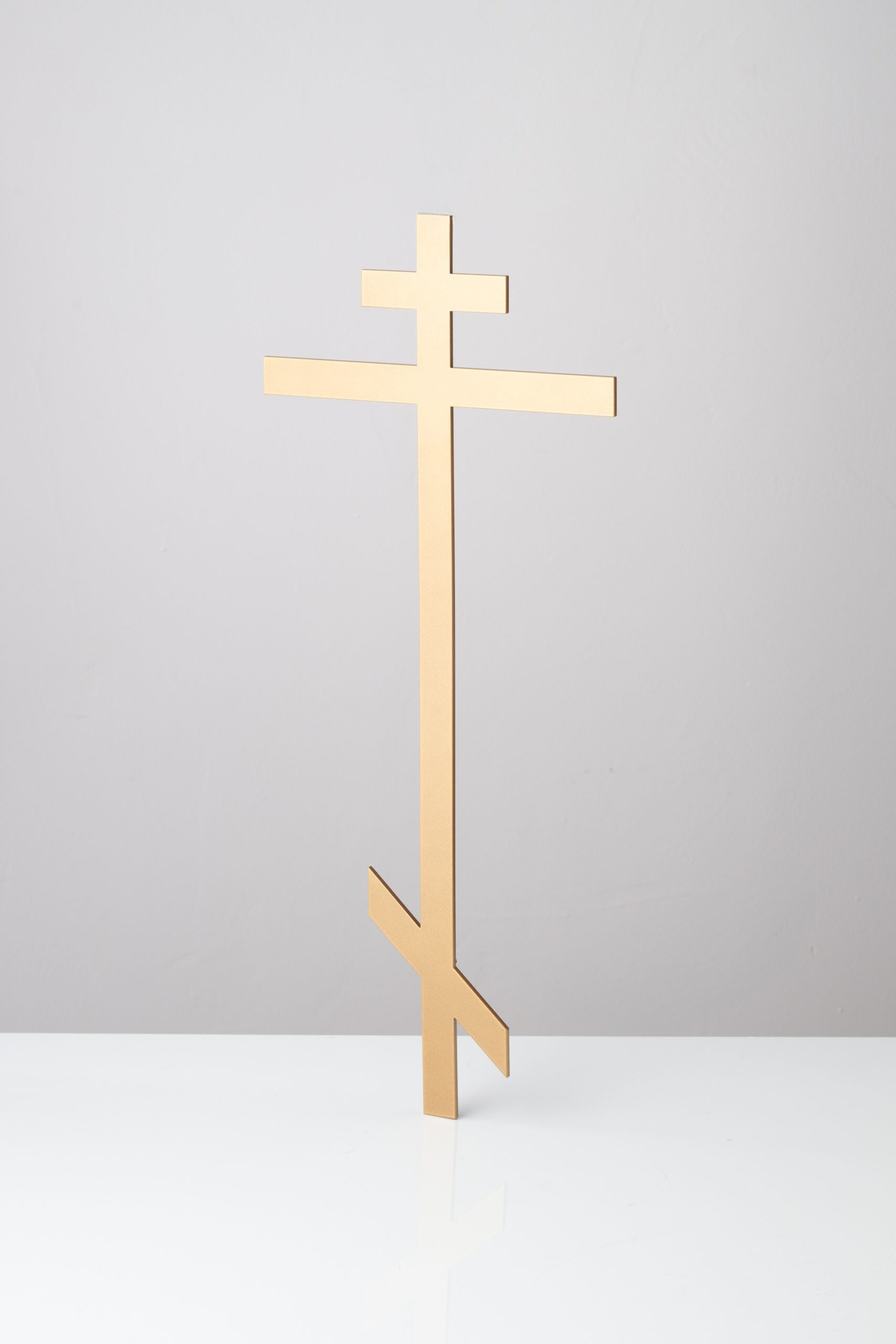 Krzyż z blachy płaskiej o grub. 3 mm. Krzyż prawosławny na bazie modelu 155. Malowany proszkowo na kolor starego złota.