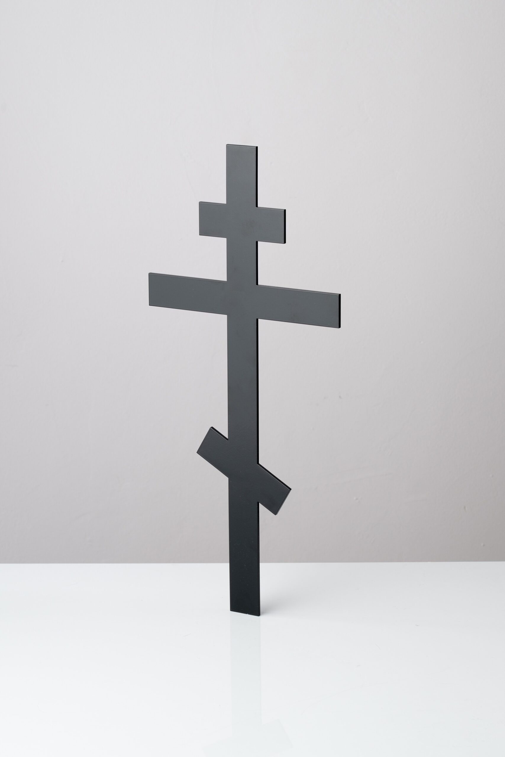 Krzyż z blachy płaskiej o grub. 3 mm. Krzyż prawosławny na bazie modelu 155. Malowany proszkowo na kolor czarny.