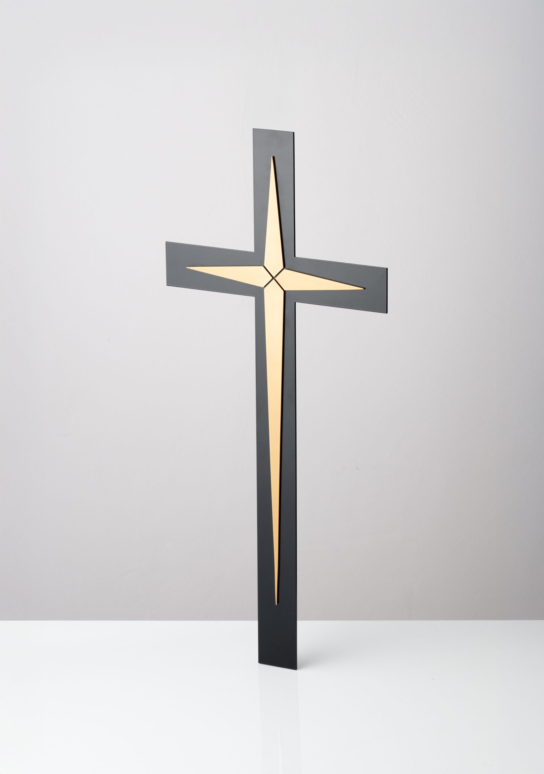 Krzyż leżący z aluminium czarny, ze złotym wzorem w części centralnej.