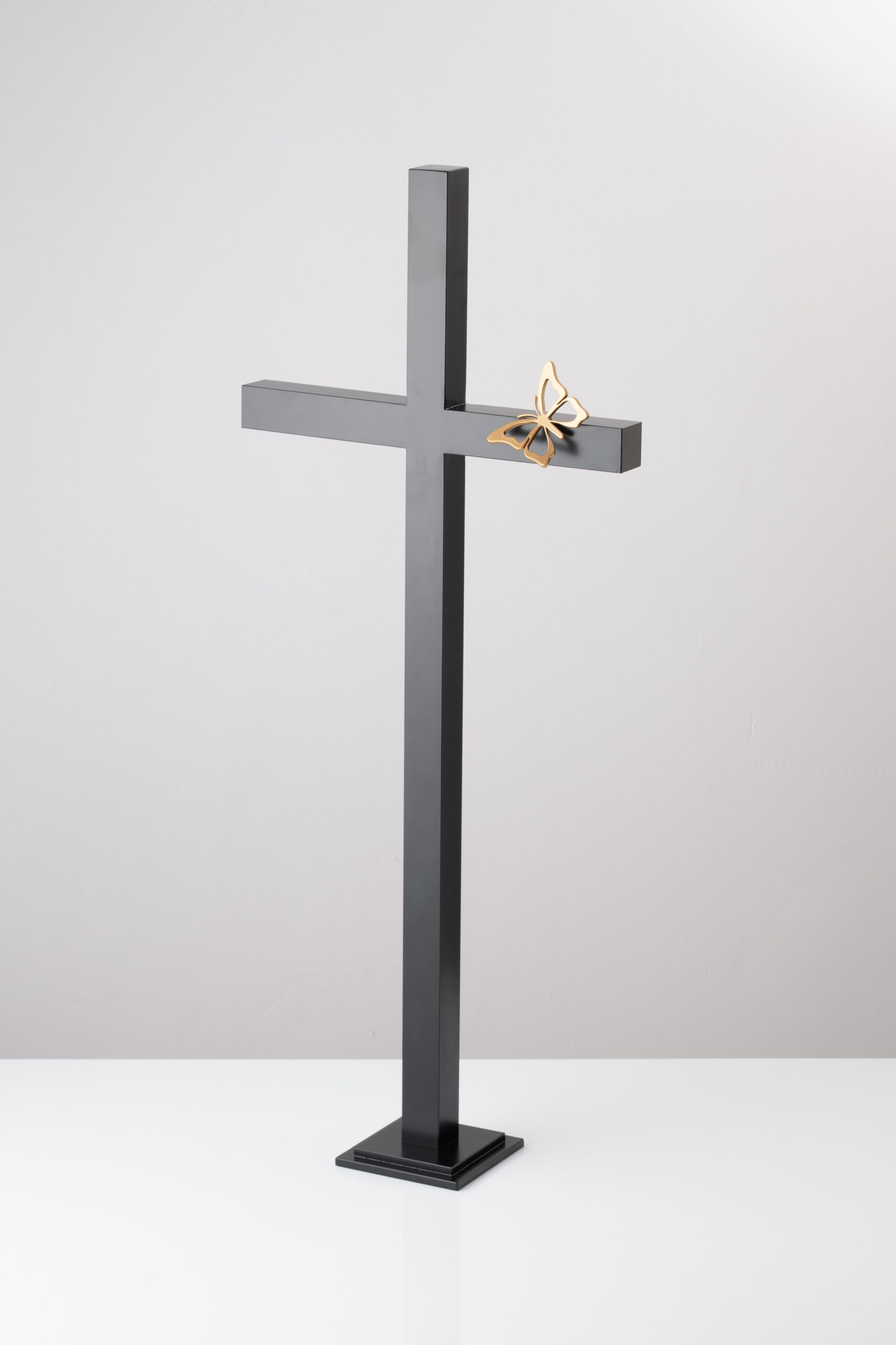 Prosty krzyż stojący z aluminium. Krzyż produkowany w kolorze czarnym, element dekoracyjny – ażurowy motylek w kolorze złotym.