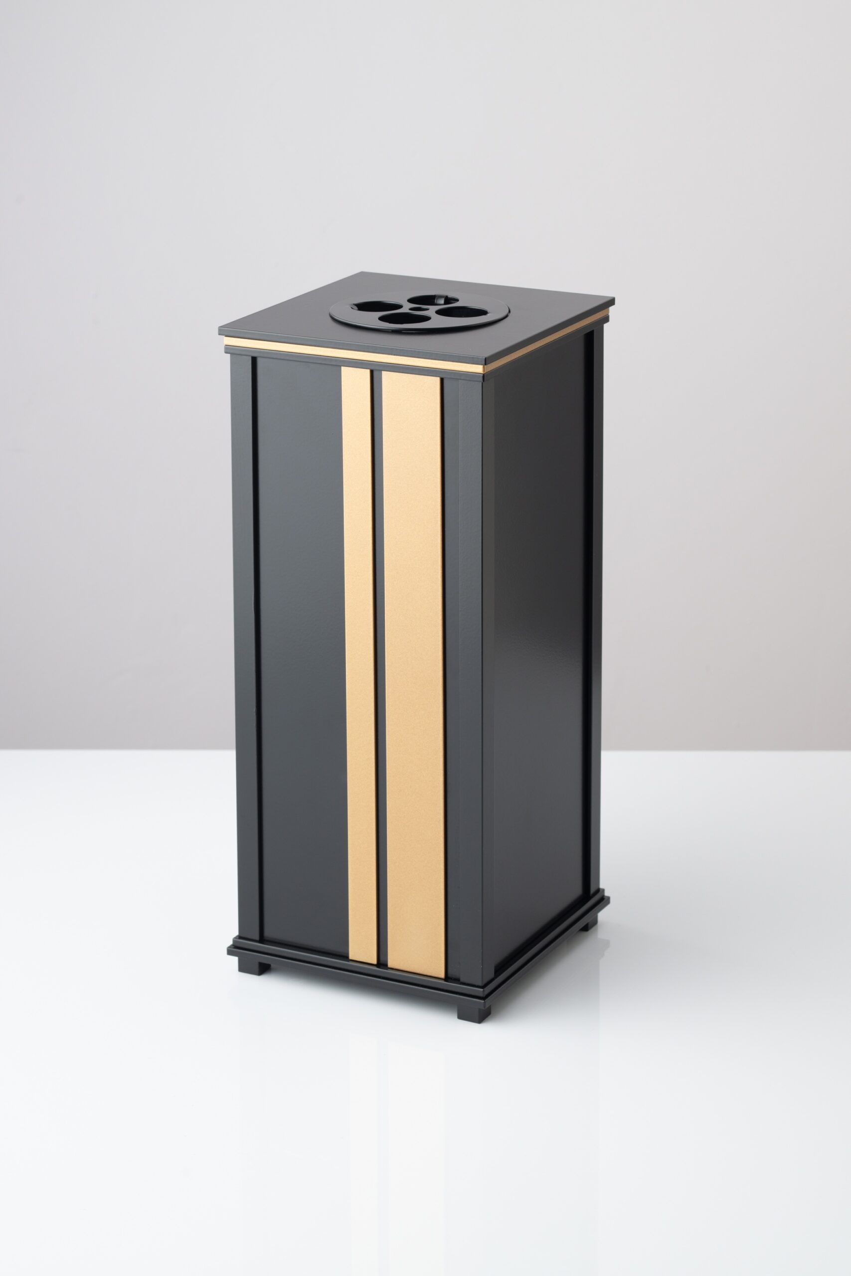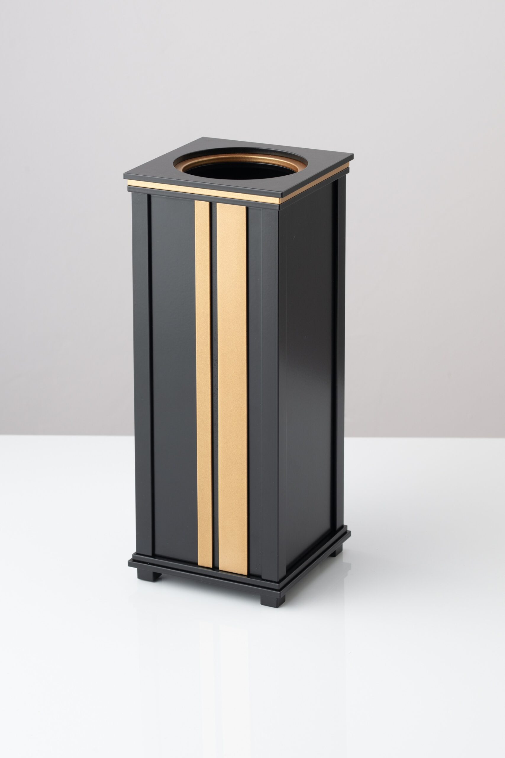 Czarny wazon z aluminium, z eleganckim elementem dekoracyjnym w kolorze złota.