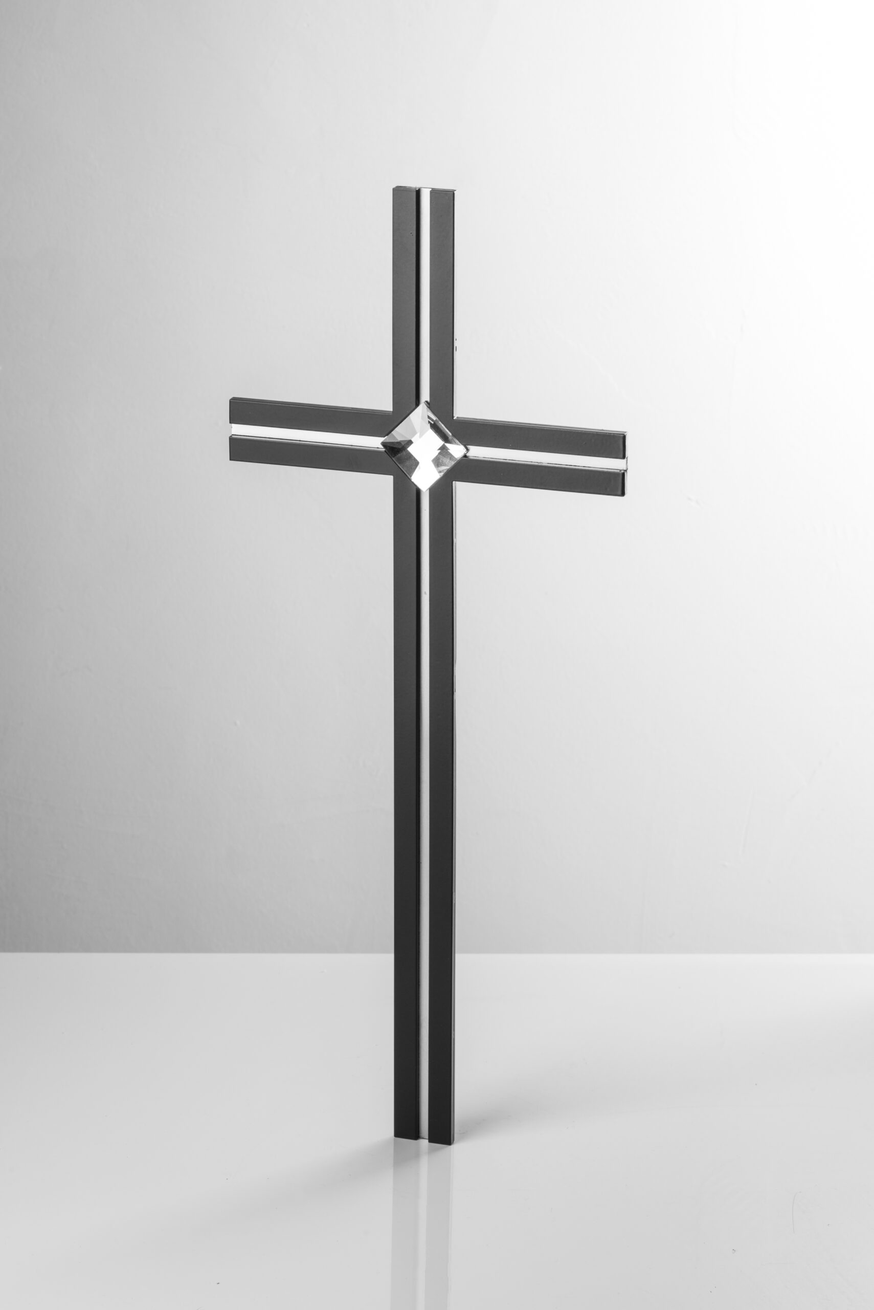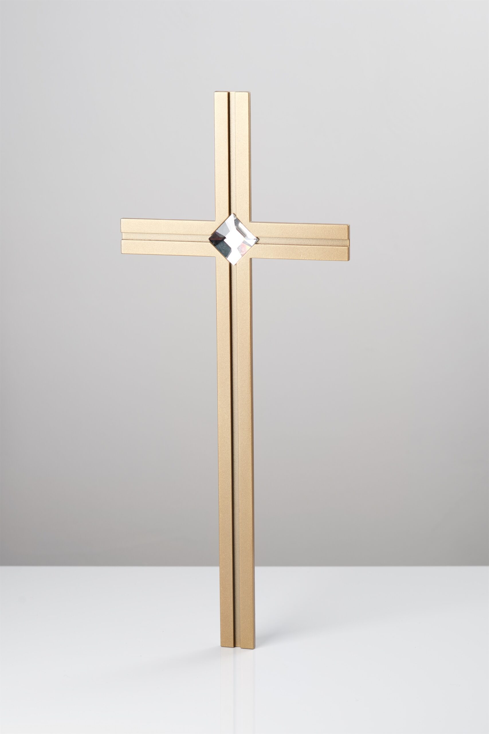 Krzyż składający się z dwóch warstw – bazy matowej i nakładek polerowanych ( rowek matowy ) z kryształkiem bezbarwnym pośrodku.
