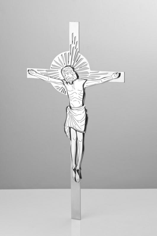 Krzyż prosty z wypukłym wizerunkiem Chrystusa. Baza matowa, Pasyjka polerowana.