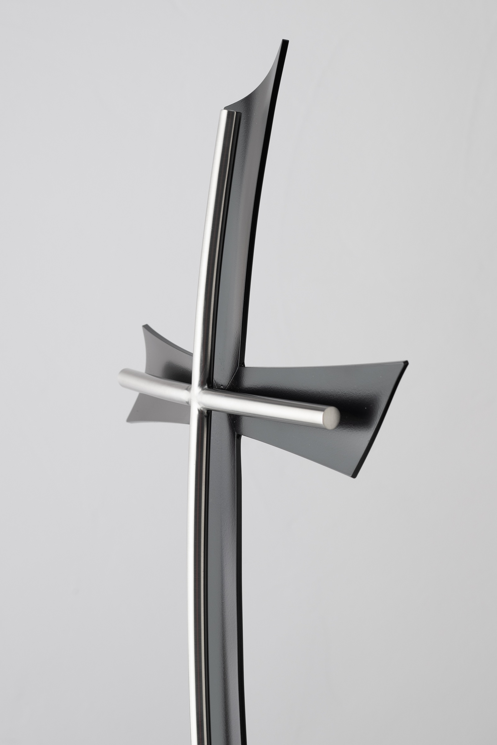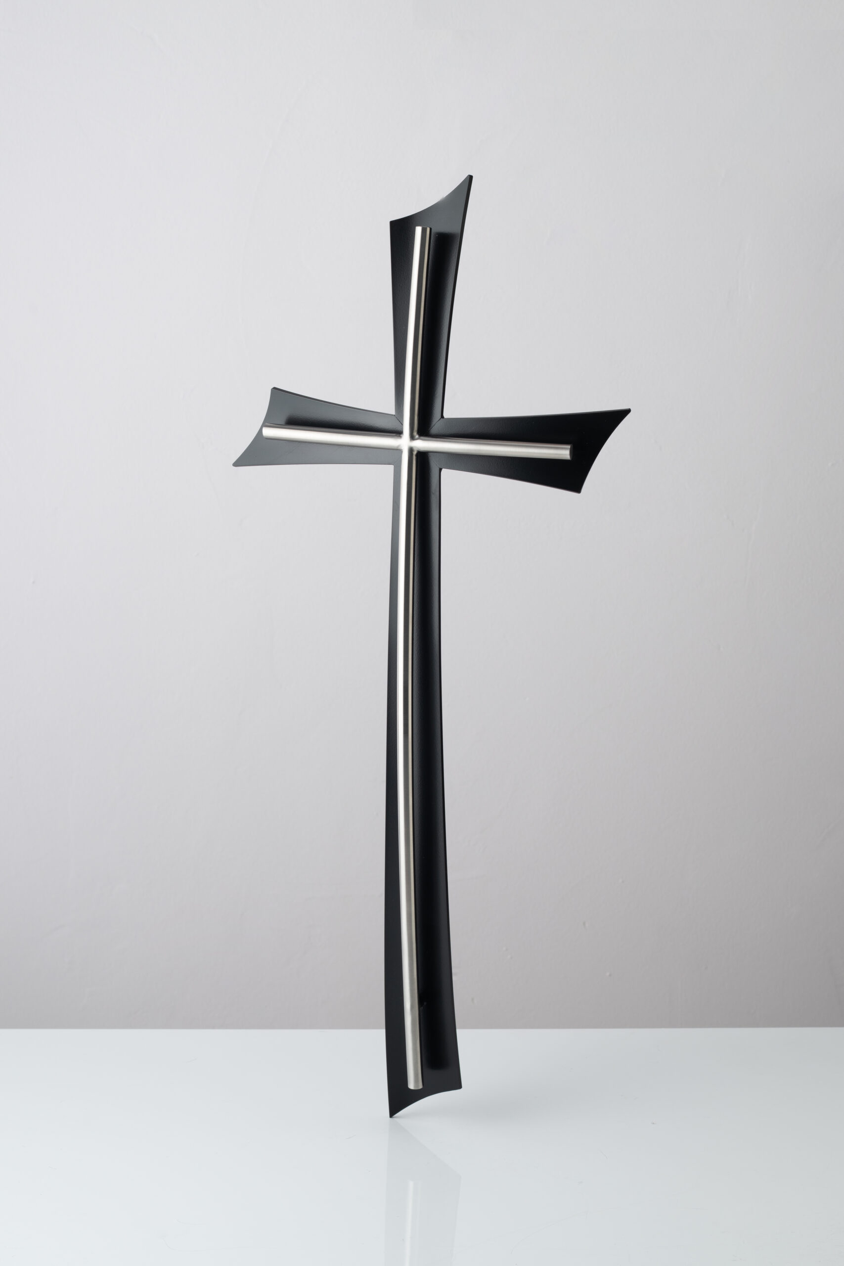 Krzyż składający się z czarnej łuski półokrągłej oraz srebrnego pręta, wygięty na składaniu.