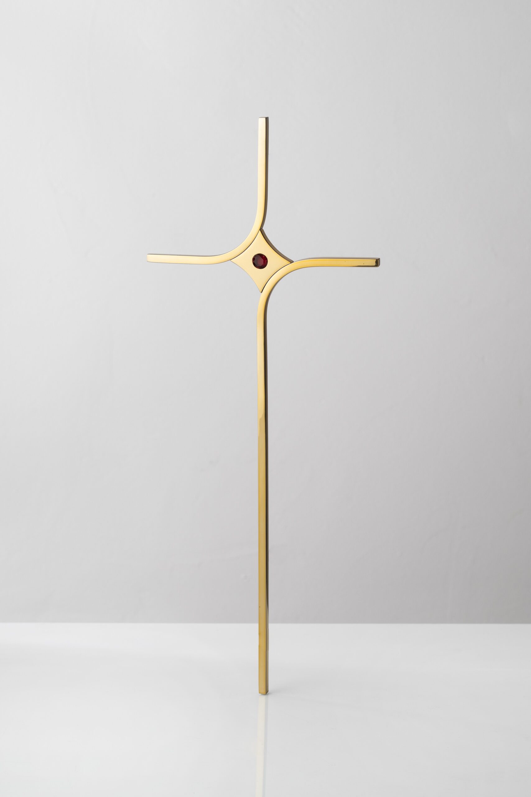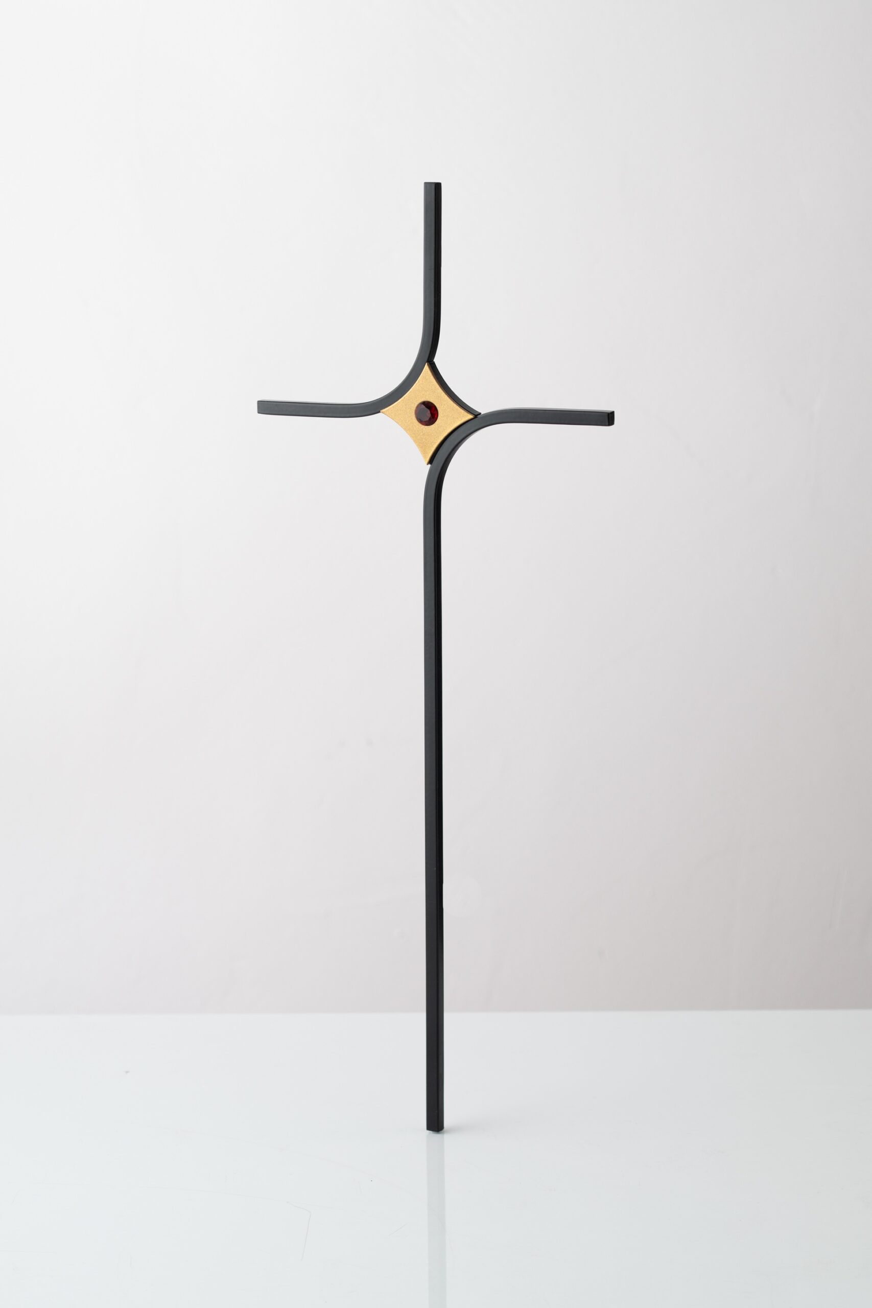 Krzyż z czarnego pręta kwadratowego o przekroju 6×6 mm oraz centralną częścią w kolorze złotym. Krzyż z czerwonym kryształkiem.