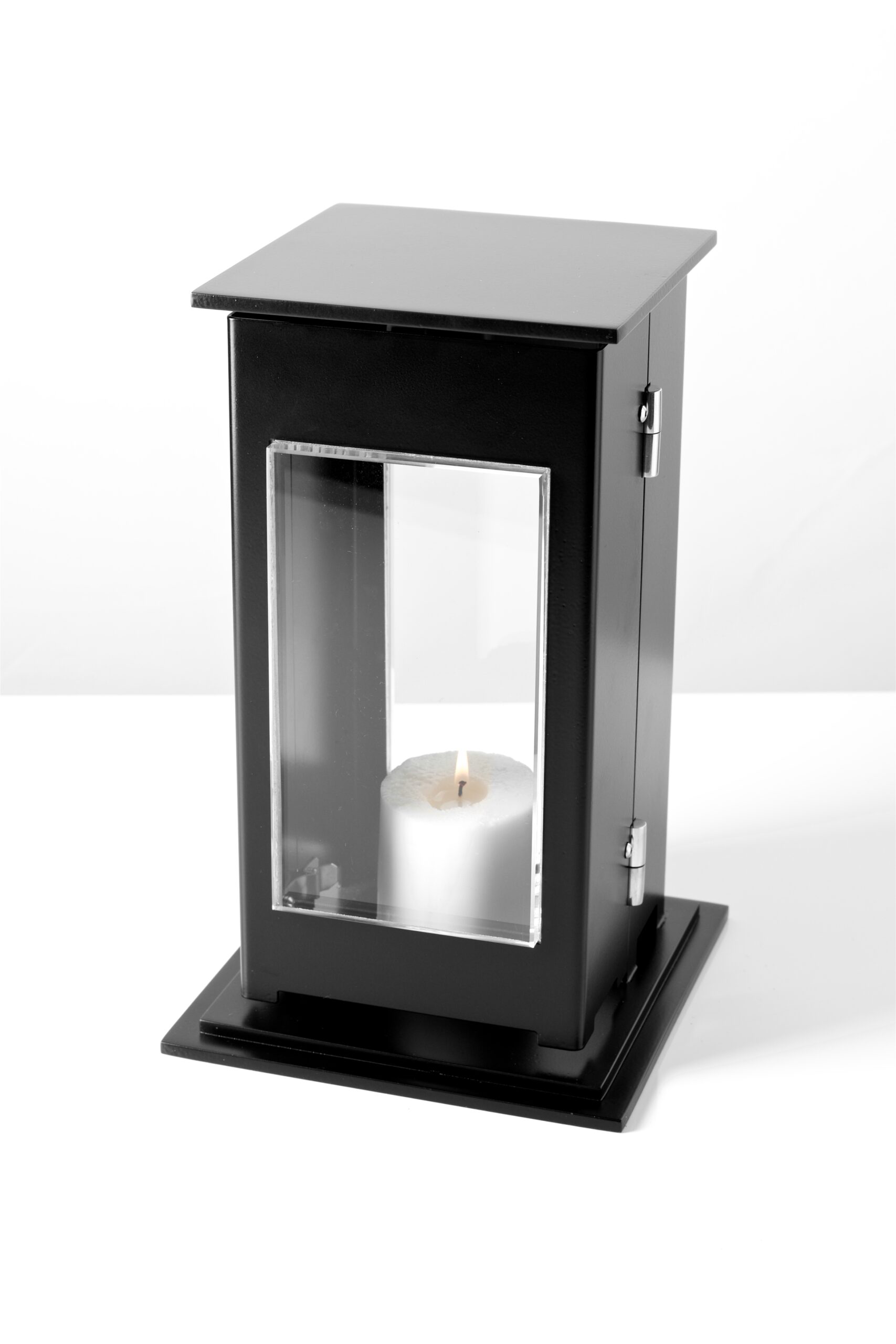 Lampion kwadratowy z dwiema szybami w kolorze bezbarwnym lub grafitowym.