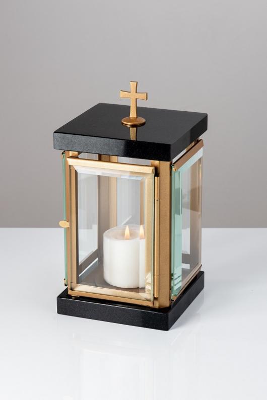 Lampion ze stali nierdzewnej z fazowanymi szybkami w kolorze bezbarwnym lub grafitowym. Podstawa i daszek z czarnego granitu.