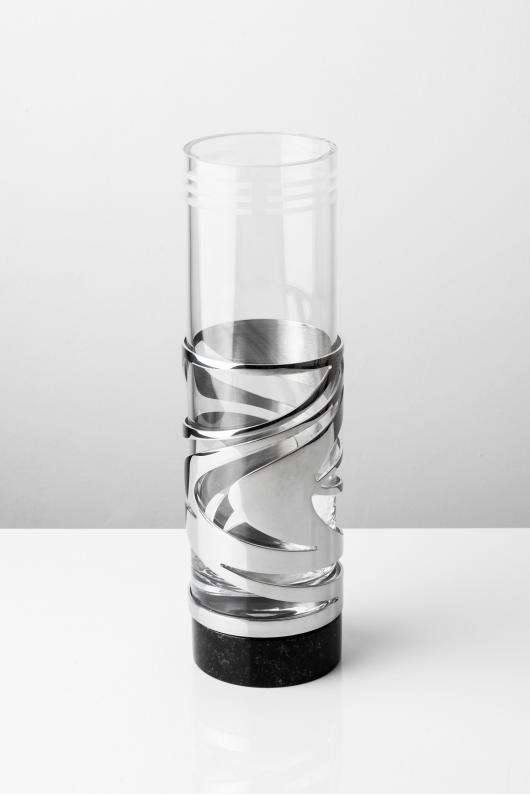 Wazon ze stali nierdzewnej z podstawą z czarnego granitu.