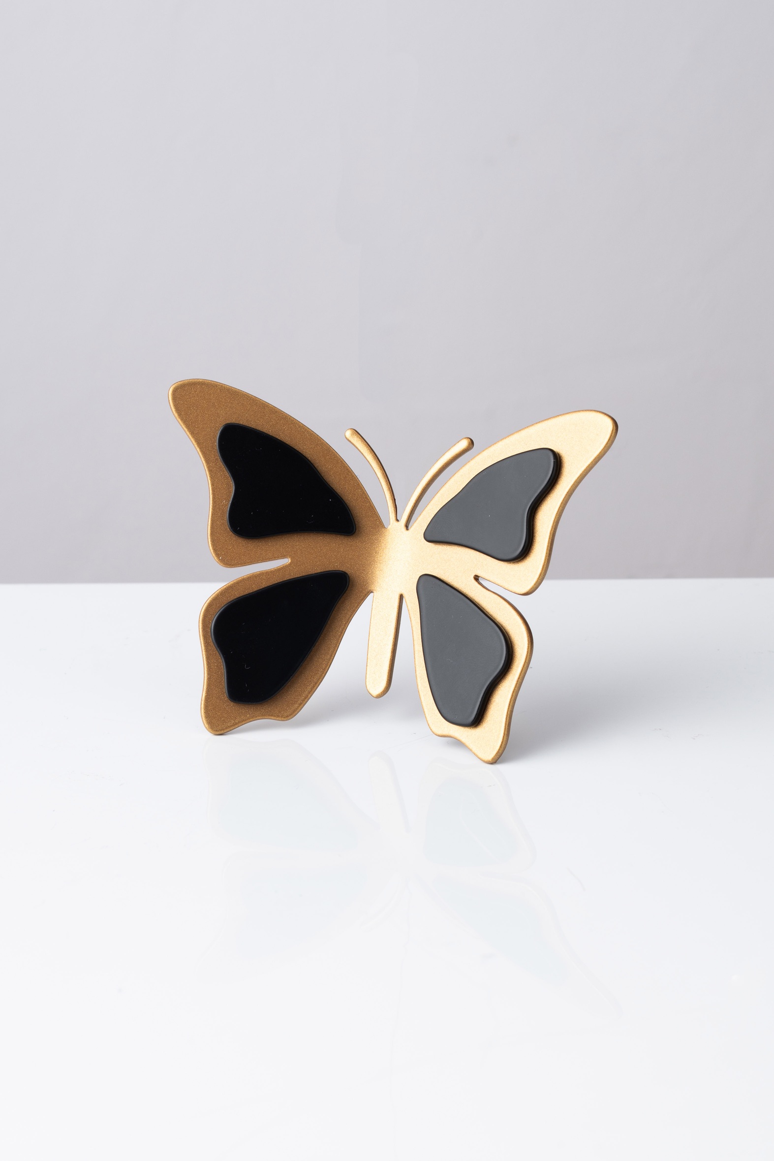 Delikatny motyl z aluminium. Podstawa aplikacji w kolorze starego złota, dekoracyjne nakładki w kolorze czarnym.