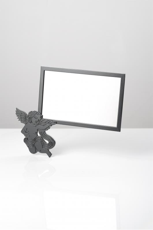 Tabliczka ze stali nierdzewnej z bazą satynową oraz ramką i aniołkiem polerowanym.