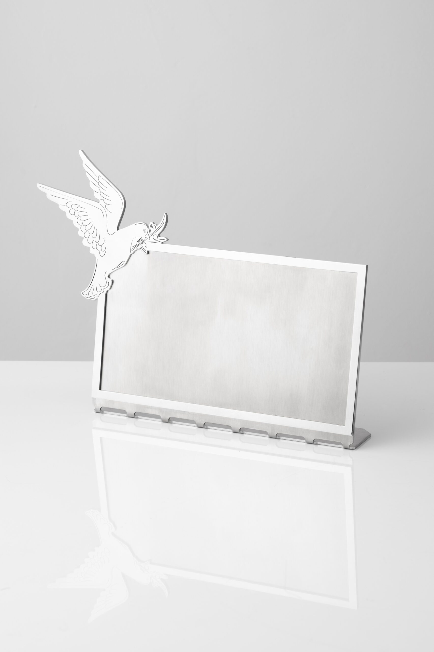 Tabliczka z gołębiem pod grawerowanie. Baza satynowa, ramka oraz element dekoracyjny polerowane. Montaż od spodu tabliczki.
